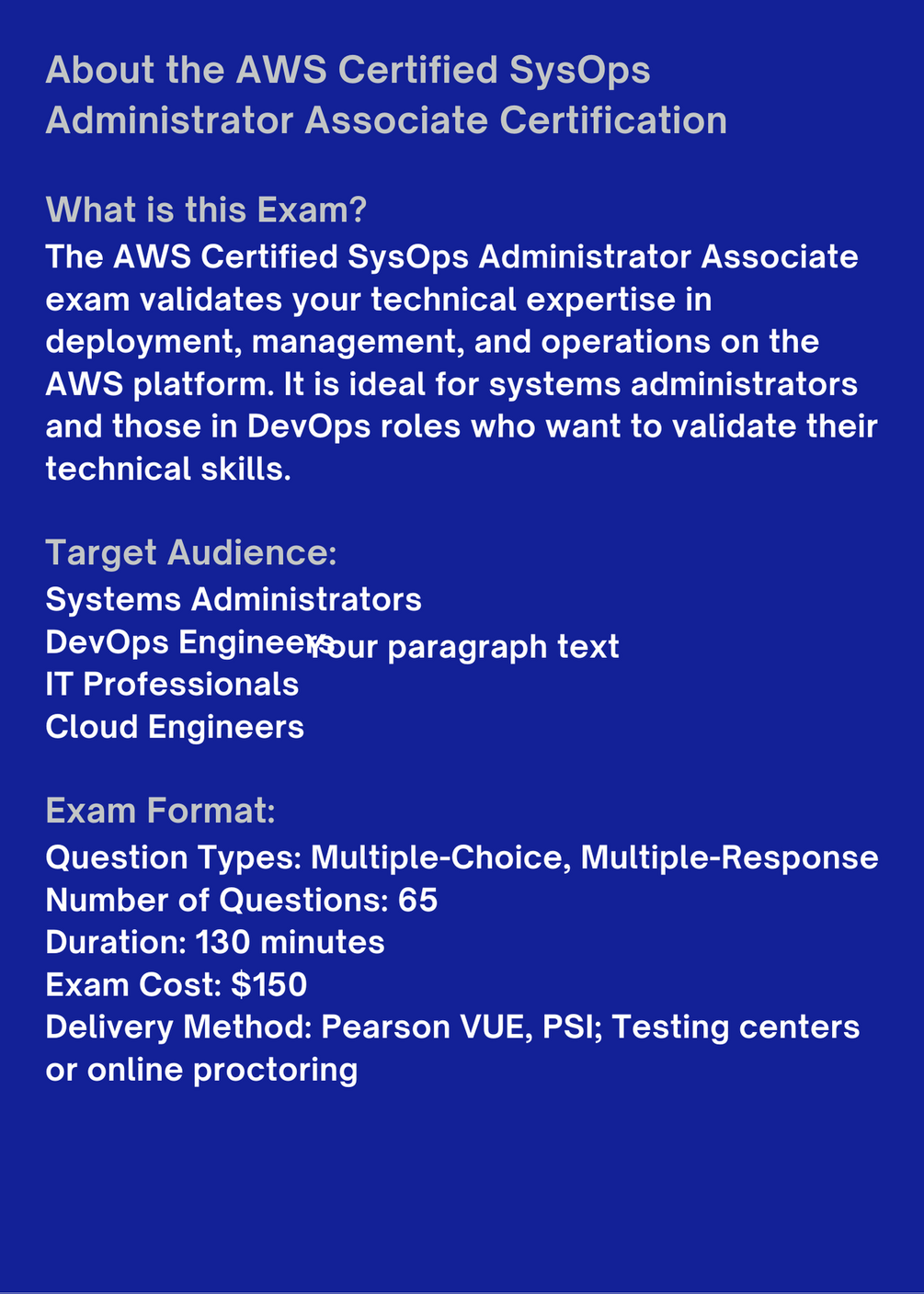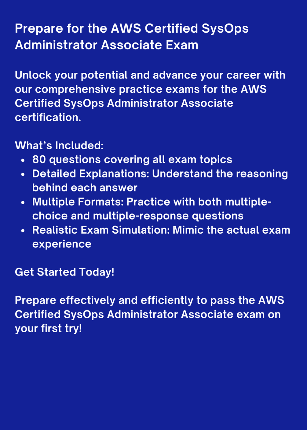 Unlock your potential and advance your career with our comprehensive practice exams for the AWS Certified SysOps Administrator Associate certification.